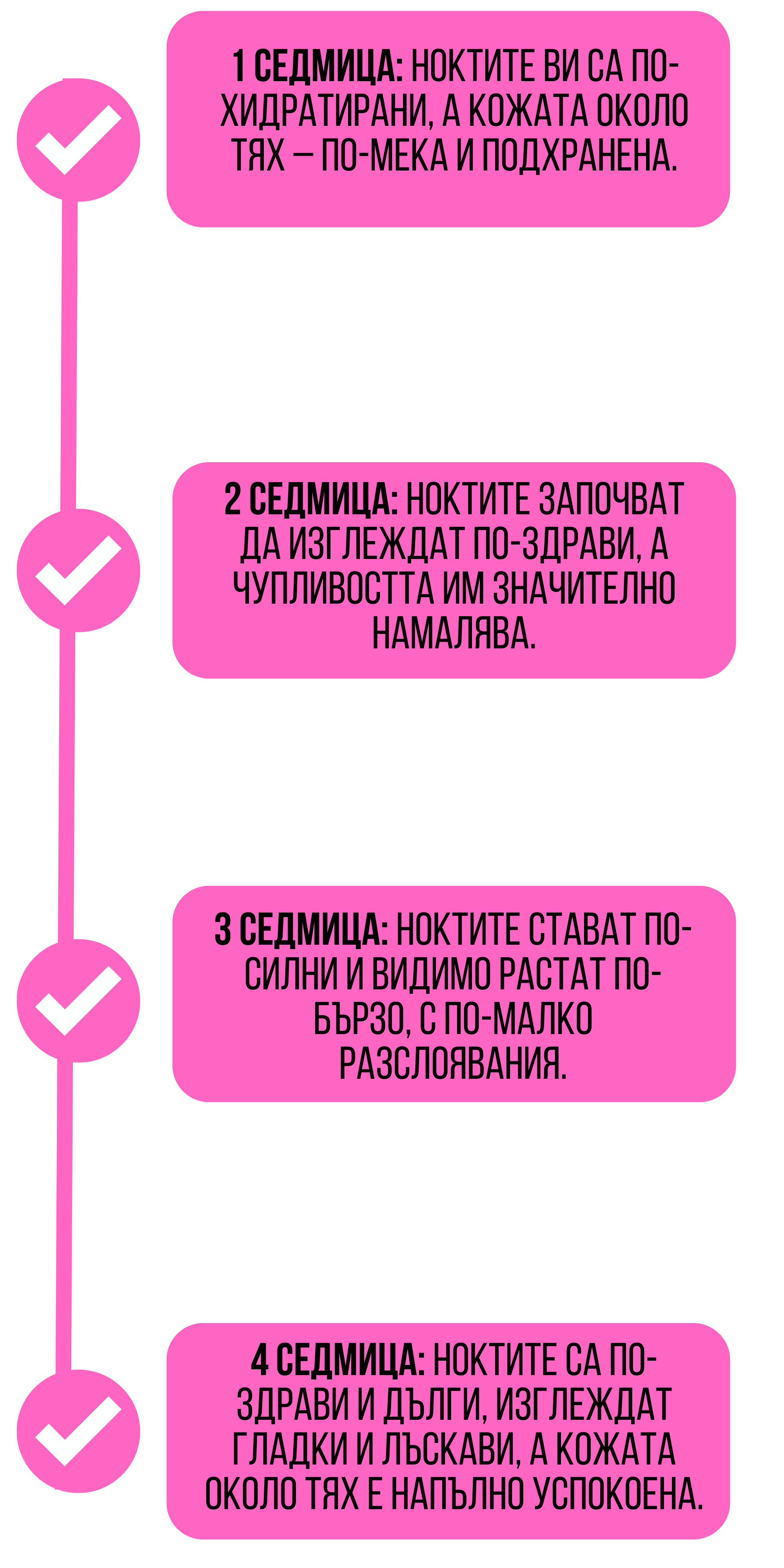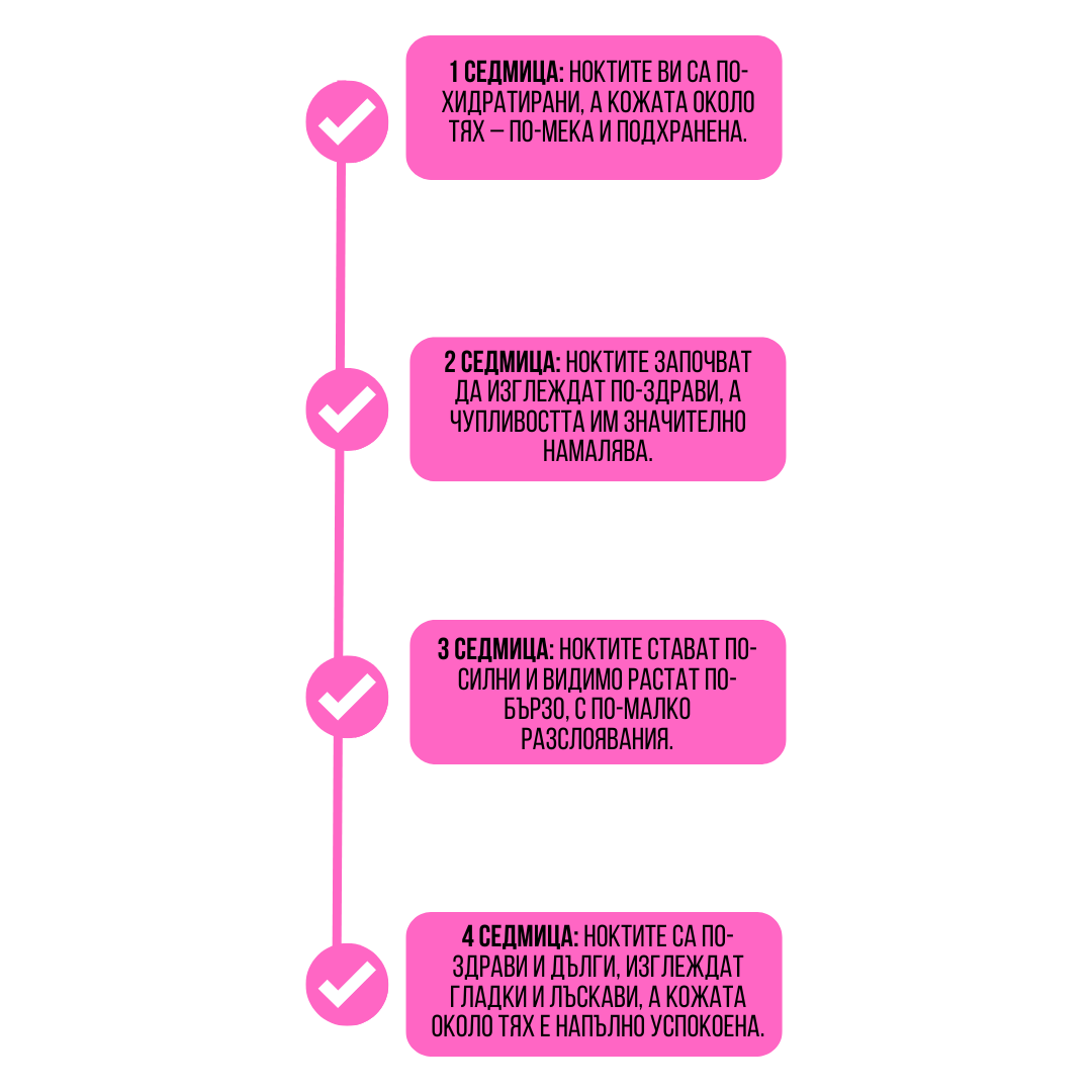 Клиничните изследвания и мнения на над 2000+ доволни клиенти и маникюристи показват, че видими резултати се постигат само след 2 седмици редовна употреба. Ние сме толкова уверени в ефективността на продукта, че предлагаме 60-дневна гаранция, ако не сте доволни от резултатите.